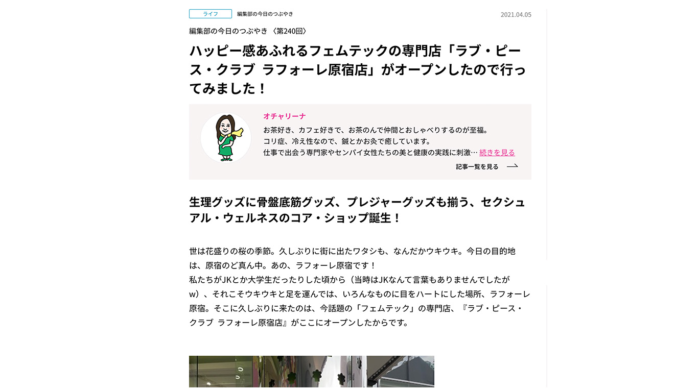 ハッピー感あふれるフェムテックの専門店「ラブ・ピース・クラブ ラフォーレ原宿店」がオープンしたので行ってみました! https://ourage.jp/column/life/daily-tweets/242301/