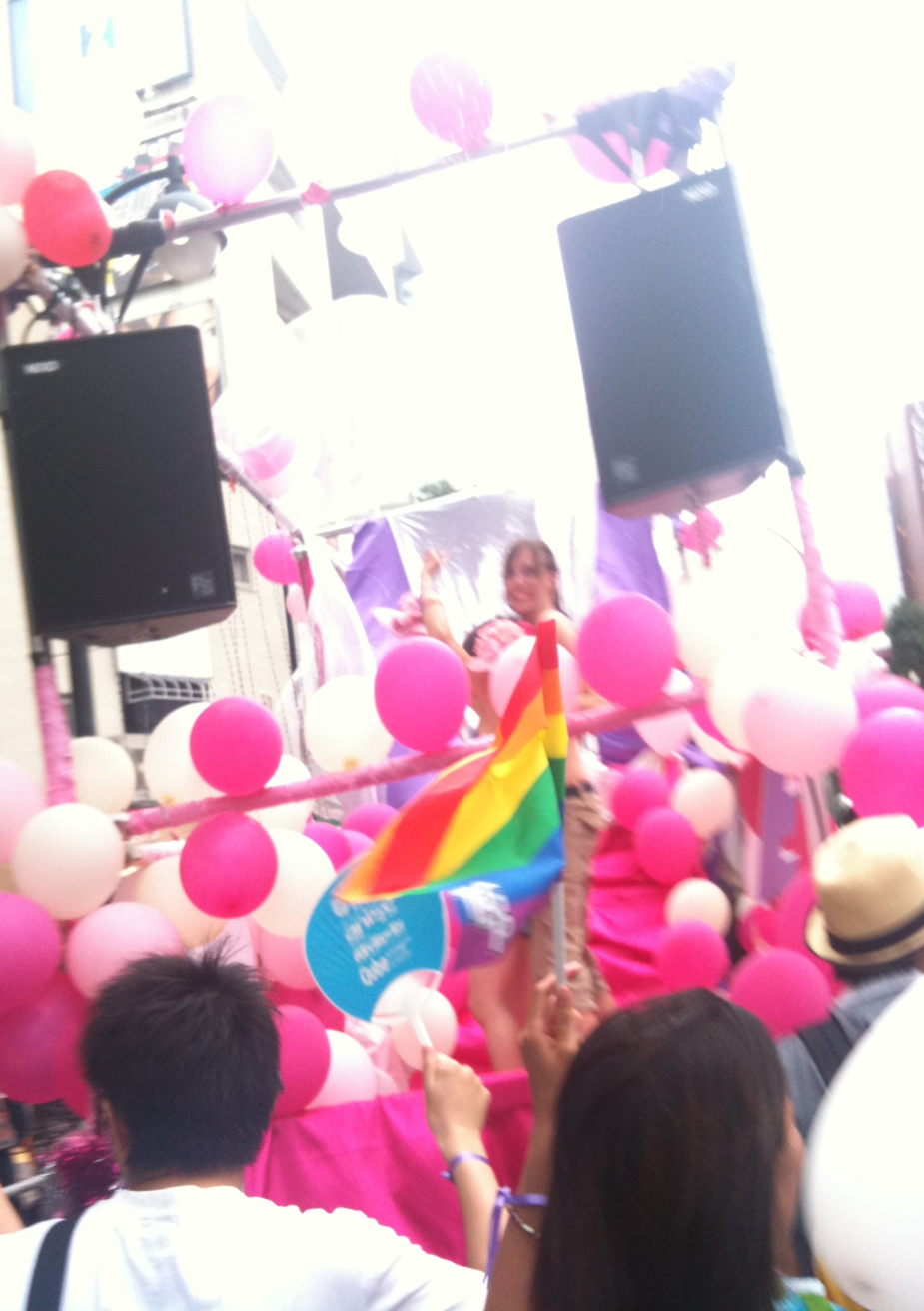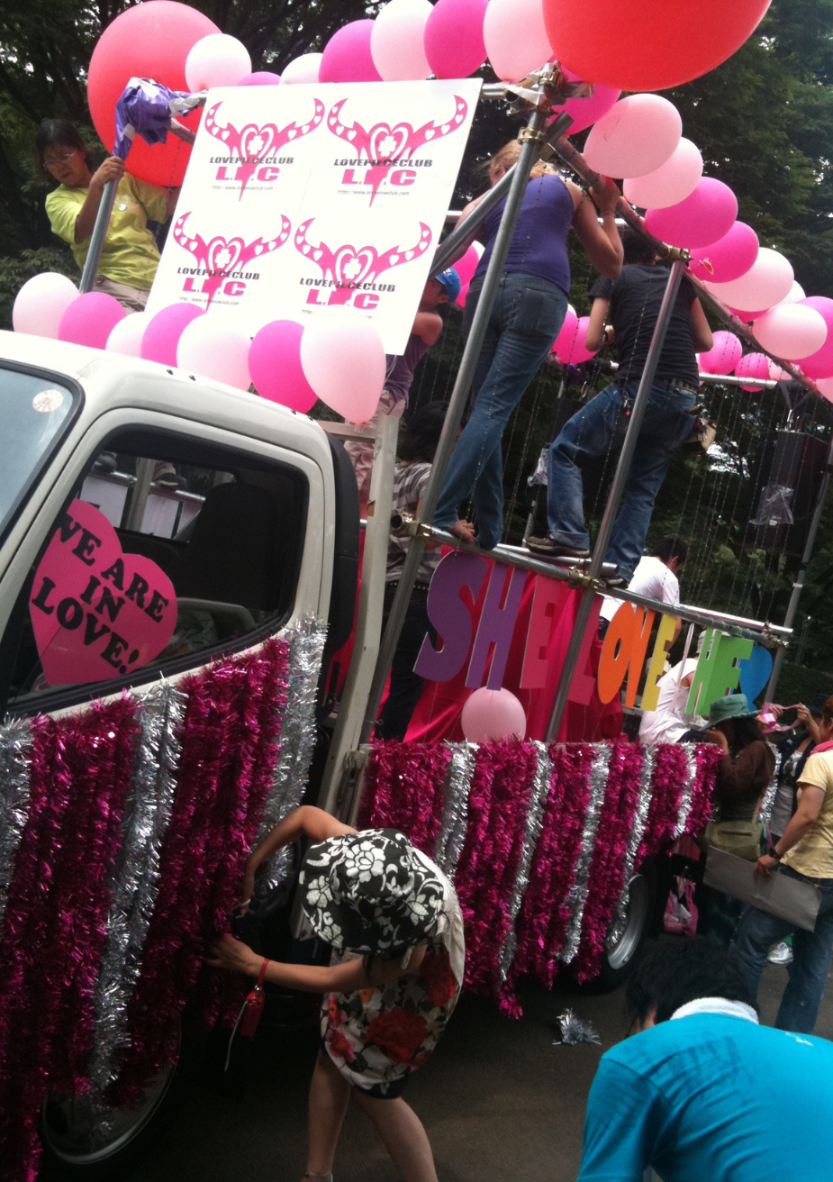 LOVE PIECE CLUBフロートを出しました。同性婚を目指し、レズビアンカップルを祝福するフロートで、多くの女性たちと共に歩きました。
