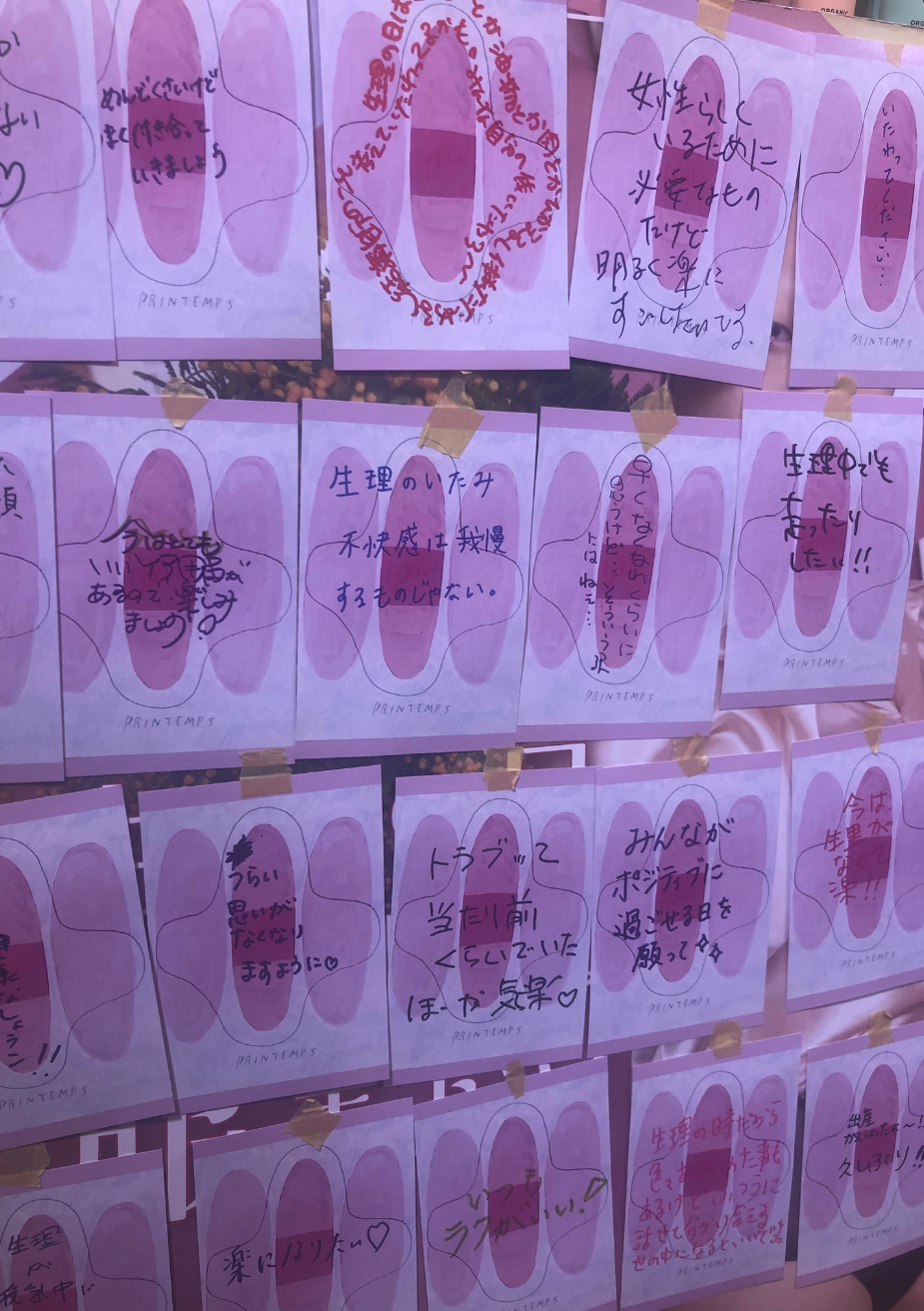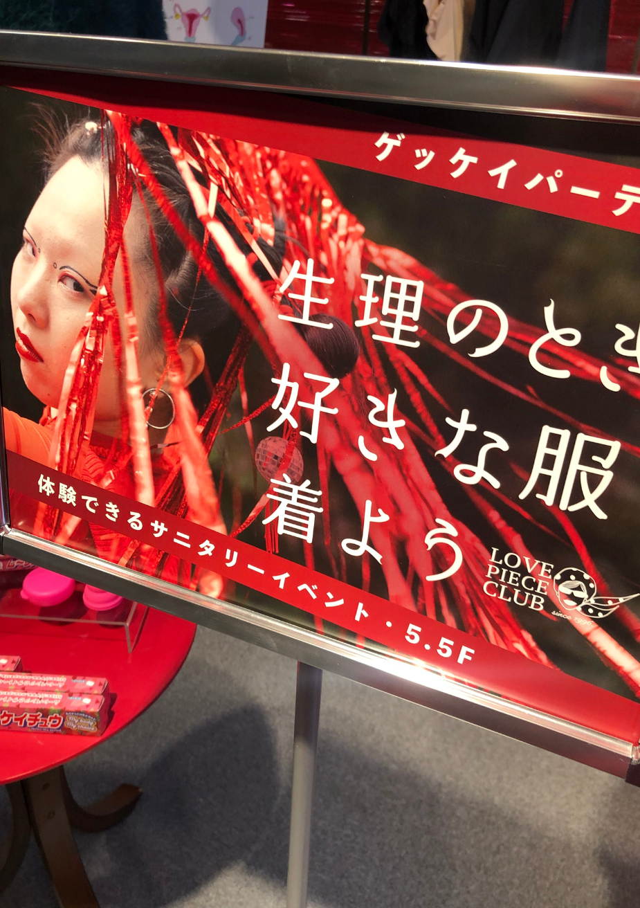 月経をテーマにしたアート作品を展示し、月経について語りあう月経パーティーをラフォーレ原宿で開催。スタッフは全員赤色の服を着て、女性たちの赤い日を祝福しました。