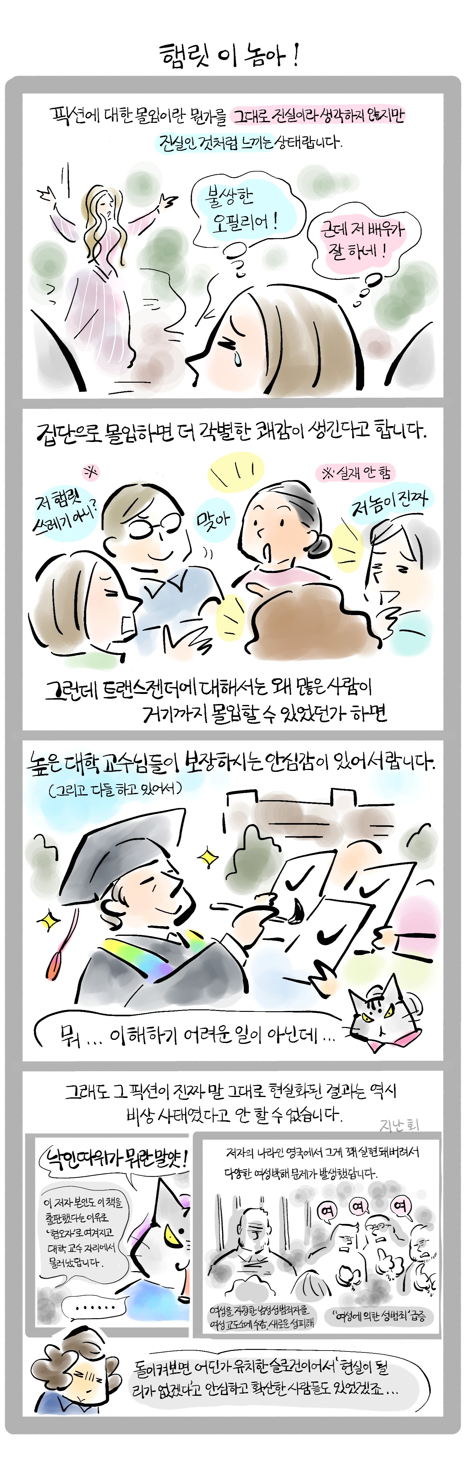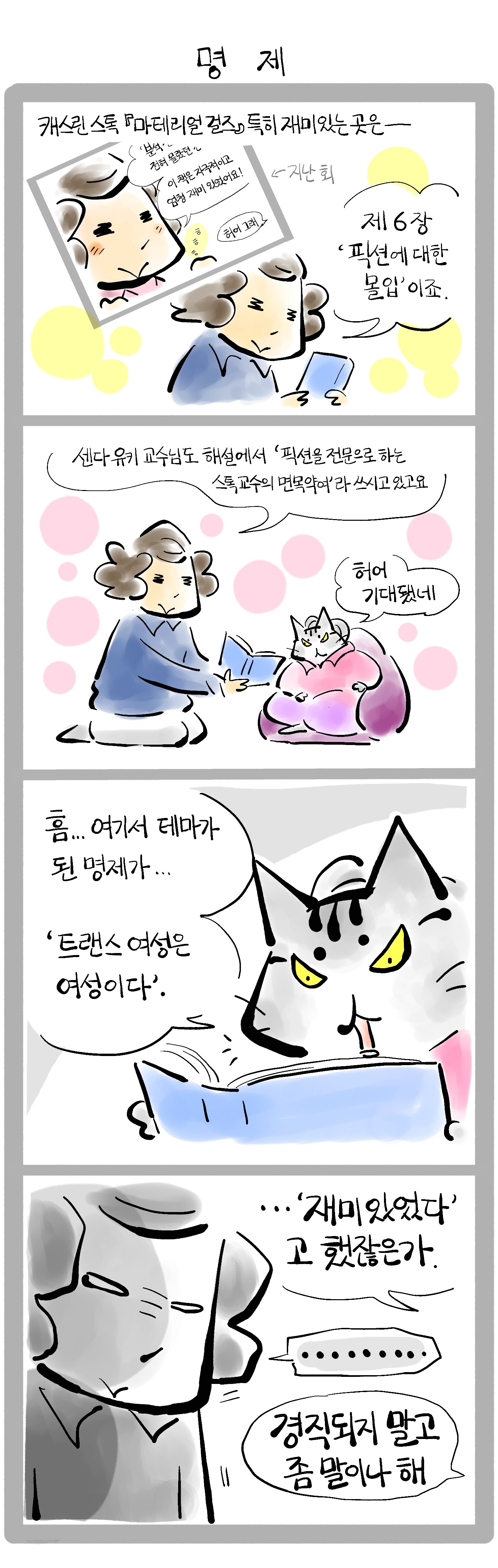 지난번에 이어서 캐스린 스톡 『마텔리얼 걸즈, 페미니즘에게 현실을 왜 중요하는가』의 이야기입니다. 픽션에 대한 몰입이라는 관점에서 젠더 아이덴티티 이론을 분석하고 있습니다.